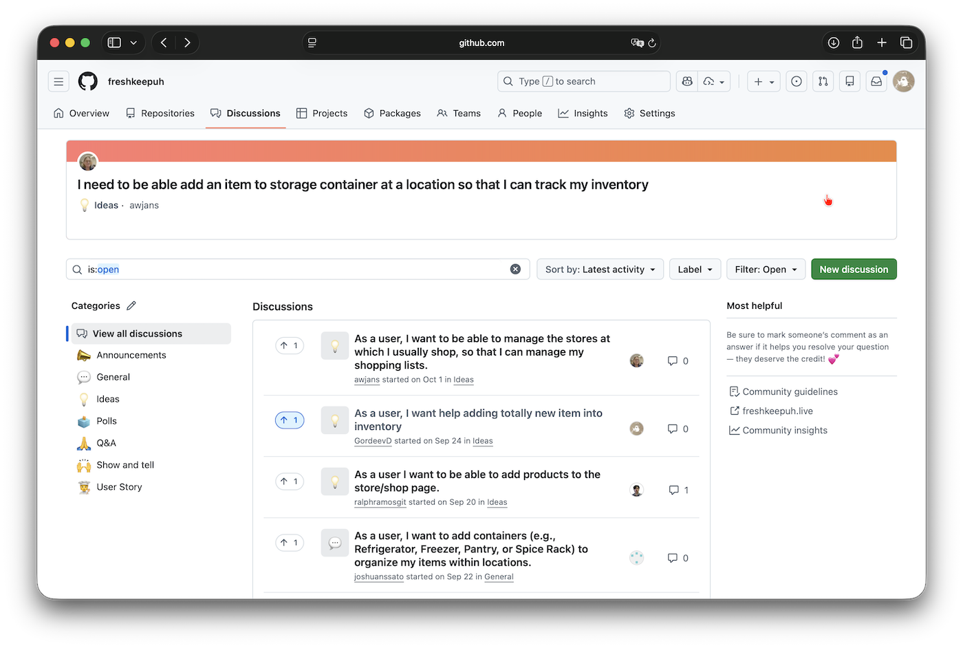 Screenshot 1: User stories at GitHub Discussions