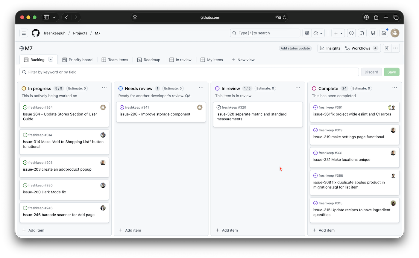 A primary takeaway from the IDPM Project Management (IDPM) was the shift toward Agile process models, team coordination, planning, and issue management. For FreshKeep, we utilized GitHub Projects and Issues to synchronize our efforts. We assigned each issue to a specific developer, linked it to a milestone, and tracked its progress on a GitHub Project board. This approach removed the haziness of who was doing what. I realized that a well-defined issue - complete with a description of the goal and acceptance criteria - is the best way to prevent miscommunication.